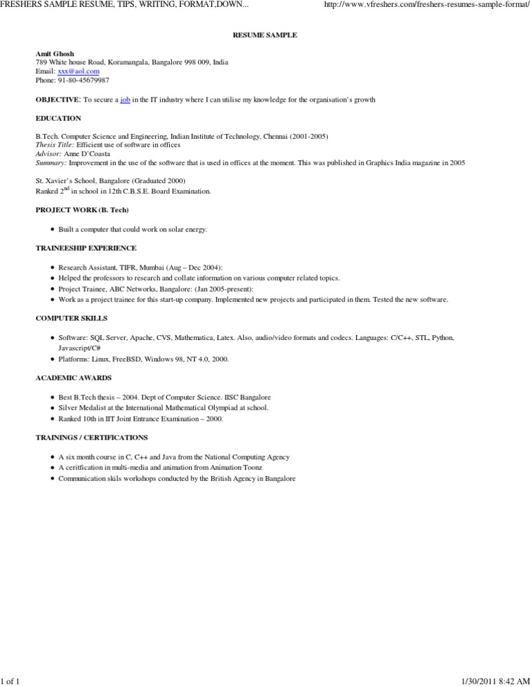 This is a sample resume of a fresher with b.tech(bachelors in technology) degree.
